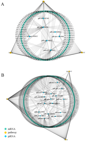 Regulatory network of A. c. cerana worker larvae. (A) Regulatory network of DEpiRNAs in Ac4 vs. Ac5. (B) Regulatory network of DEpiRNAs in Ac5 vs. Ac6.