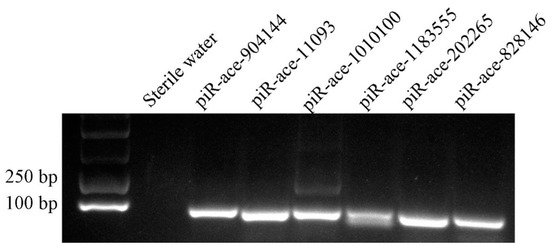 The total RNA from 4-, 5-, and 6-day-old A. c. cerana larval guts were extracted using a FastPure® Cell/Tissue Total RNA Isolation Kit V2 (Vazyme, Nanjing, China). The concentration and purity of the RNA were checked with a Nanodrop 2000 spectrophotometer (Thermo Fisher, Waltham, MA, USA). A total of three DEpiRNAs (piR-ace-1010100, piR-ace-1183555, and piR-ace-202265,) from the Ac4 vs. Ac5 comparison group were randomly selected for stem-loop RT-PCR validation, and three (piR-ace-828146, piR-ace-904144, and piR-ace-11093) from Ac5 vs. Ac6 comparison group. Specific stem-loop primers and forward primers (F) as well as universal reverse primers (R) were designed using DNAMAN software and then synthesized by Sangon Biotech (Sangon Biotech, Shanghai, China). According to the instructions of HiScript® 1st Strand cDNA Synthesis Kit, cDNA was synthesized by reverse transcription using stem-loop primers and used as templates for PCR of DEpiRNA. Reverse transcription was performed using a mixture of specific loop primers and oligo (dT) primers, and the resulting cDNA was used as templates for PCR. The PCR system (20 μL) contained 1 μL of diluted cDNA, 10 μL of PCR mix (Vazyme, Nanjing, China), 1 μL of forward primers, 1 μL of reverse primers, and 7 μL of diethyl pyrocarbonate (DEPC) water. The PCR was conducted on a T100 thermocycler (Bio-Rad, Hercules, CA, USA) under the following conditions: pre-denaturation step at 95 °C for 5 min; 40 amplification cycles of denaturation at 95 °C for 10 s, annealing at 55 °C for 30 s, and elongation at 72 °C for 1 min, followed by a final elongation step at 72 °C for 10 min. The amplification products were detected on 1.8% agarose gel electrophoresis with Genecolor (Gene-Bio, Shenzhen, China) staining.