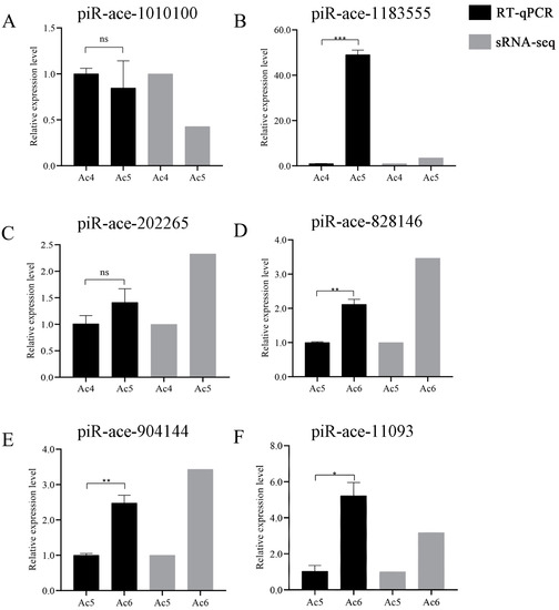 RT-qPCR verification of six A. c. cerana DEpiRNAs. (A–C) Relative expression levels of piRNAs from the Ac4 vs. Ac5 comparison group. (D–F) Relative expression level of piRNA from the Ac5 vs. Ac6 comparison group. ns indicates non-significant, * indicates p < 0.05, ** indicates p < 0.01 and *** indicates p < 0.001.