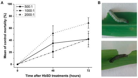 2.2. Virulence of HbSD against S. frugiperda Larvae in Petri Plate Bioassay