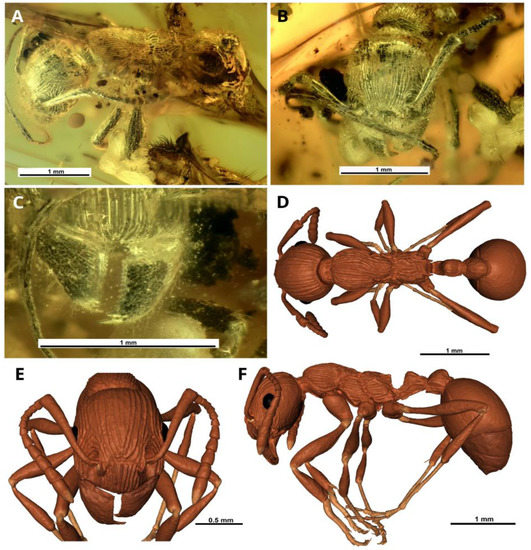 †Manica andrannae sp. nov., holotype, photomicrographs (A–C) and paleontological reconstruction (3D models) (D–F). Worker: A,F—habitus, left lateral view; B,E—head, frontal view; C—clypeal margin and mandibles; D—habitus, dorsal view.