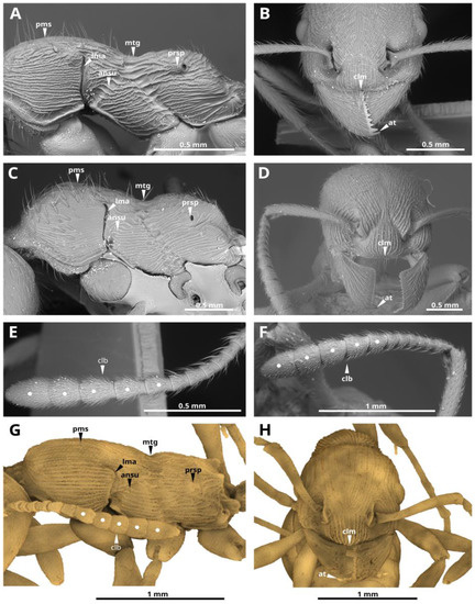 Select key features of the Manica species. SEM micrographs of M. invidia (A,B,E), M. rubida (C,D,F) and µCT volume rendering of †M. andrannae sp. n. (G,H). Worker: A,C,G—mesosoma, left lateral view; B,D,H—head, frontal view; E,F—flagellum. Abbreviations: promesonotal suture (pms), metanotal groove (mtg), propodeum spiracle (prsp), lateropronotal mesopleural articulation (lma), anapleural sulcus (ansu), clypeal margin (clm), apical tooth (at), antennal club (clb).