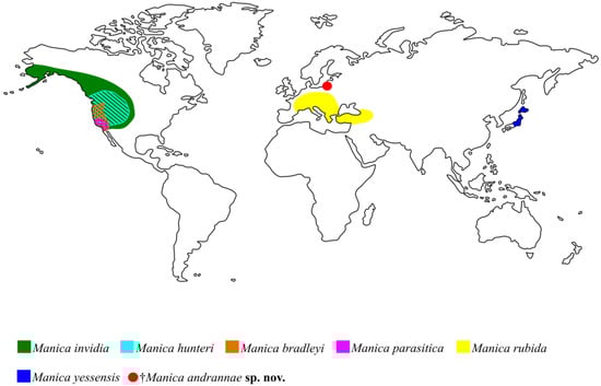 Diagrammatic representation of the distribution of the Manica species: filled and shaded area—recent species; red circle—fossil record from Baltic amber.