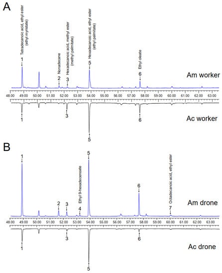 Total ion chromatograms (TIC) of headspace volatiles of Apis mellifera (Am) and Apis cerana (Ac) larvae. Only the right ends of the four TICs were shown and organized according to worker (A) and drone (B) larvae. The main compounds were: (1) tetradecanoic acid, ethyl ester (ethyl myristate); (2) nonadecane; (3) hexadecanoic acid, methyl ester (methyl palmitate); (4) ethyl 9-hexadecenoate; (5) hexadecanoic acid, ethyl ester (ethyl palmitate); (6) ethyl oleate; and (7) octadecanoic acid, ethyl ester.