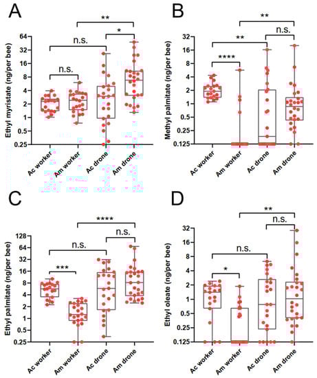 Comparison of the amount of four aliphatic esters ethyl myristate (A), methyl palmitate (B), ethyl palmitate (C), and ethyl oleate (D) among the worker and done larvae in both Apis mellifera (Am) and Apis cerana (Ac). Boxes include the 25th–75th percentile. Horizontal bars denote the median value. Whiskers indicate the values that are no further than 1.5 × IQR from either the upper or the lower hinge. Each dot represents one larval sample. The sample size (n) is 19, 23, 22, and 26 for Ac worker, Ac drone, Am worker, and Am drone, respectively. Statistical significance is determined by Kruskal–Wallis test followed by Dunn’s test for post hoc comparison. n.s. not significant, * p < 0.05, ** p < 0.01, *** p < 0.001, **** p < 0.0001.