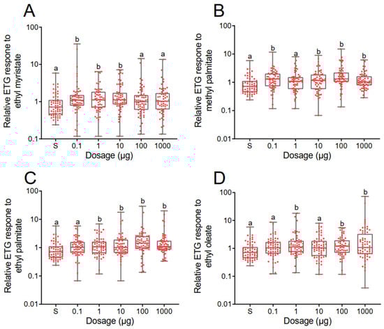 Electrophysiological responses of Varroa destructor to ethyl myristate (A), methyl palmitate (B), ethyl palmitate (C), and ethyl oleate (D). For each test chemical, five dosages (0.1, 1, 10, 100, 1000 µg) and solvent control (s) were included. All the responses to test compounds were calibrated to control (0.5). Each red dot represented one replicate (one mite) and 60 replicates (n = 60) were included for every single dosage and solvent control. Boxes include the 25th–75th percentile. Horizontal bars inside each box show the median value. Whiskers suggest values that are no further than 1.5 × IQR from either the upper or the lower hinge. Kruskal–Wallis tests were employed to determine the significant differences and Dunn’s tests were used for post hoc comparison. Every response to the test compounds was compared to solvent control, and a different lowercase letter was labeled to indicate significant differences (p < 0.05).