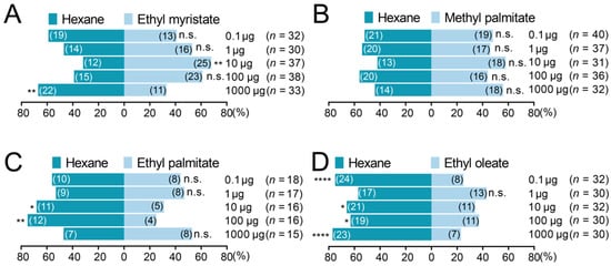 Olfactory responses of Varroa destructor to ethyl myristate (A), methyl palmitate (B), ethyl palmitate (C), and ethyl oleate (D) in Y-tube olfactometer assays. The numbers inside the bars represent the counts of Varroa mites selecting the corresponding arm data were analyzed using Chi-square test. * p < 0.05, ** p < 0.01, **** p < 0.0001, n.s. not significant.