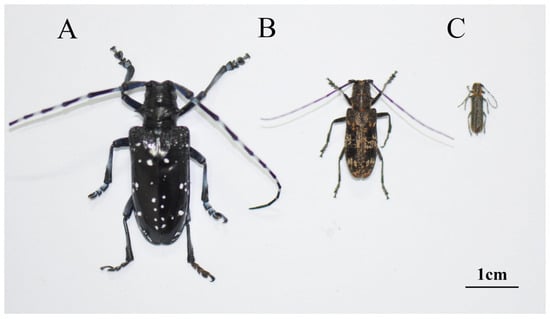 Images of three cerambycid beetle species. (A): Anoplophora chinensis, (B): Monochamus saltuarius, (C): Saperda populnea.