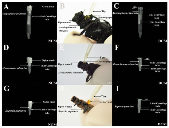 First, the volume of collection tube A was selected according to the sizes of cerambycid beetles, and a nylon net of the corresponding size was cut. A slightly smaller collection tube B or other rod of suitable size was then used to press the nylon net against the edges of collection tube A, so that the nylon net formed a suitable storage space in collection tube A. Third, the nylon net was fixed on collection tube A with sealing film, and collection tube B was removed. Finally, one pair of antennae and one pair of forelegs were cut off the cerambycid beetles. When a drop of haemolymph spilled out of any of the broken parts of the beetle, the individual was placed head down into the collection tube for centrifugation. A 10 mL collection tube was used for A. chinensis (Figure 2A), and 1.5 mL collection tubes were used for M. saltuarius and S. populnea (Figure 2D,G). A gap between the head of the cerambycid beetle and the bottom of the nylon net prevented damage caused by head impact. According to a gradient experiment, the rotation speed for A. chinensis was set to 4000 rpm, the rotation speed for M. saltuarius was set to 8000 rpm, and the rotation speed for S. populnea was set to 8500 rpm, with a time of 35–40 s and temperature of 4 °C.