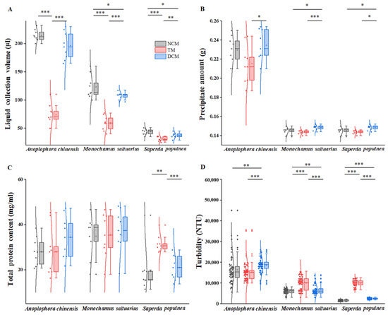 Results of three haemolymph collection methods for three species. (A): collection volumes; (B): precipitate amounts; (C): total protein contents; (D): turbidity. NCM, net centrifugation method; TM, tearing method; DCM, double centrifugation method. Samples, black dots; ±SD, hollow dots; median, middle line inside each box; IQR (interquartile range), the box containing 50% of the data; whiskers, 1.5 times the IQR. Normal of distribution, curved line. * p < 0.05; ** p < 0.01; *** p < 0.001.