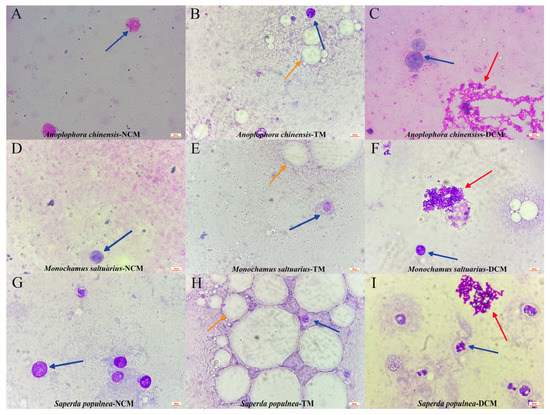 Microscopic examination of smears from three cerambycid beetle species for different collection methods under a 100× oil immersion lens. Blue arrows point to haemocytes; yellow arrows point to fat cells; red arrows point to blood coagulation. (A–C): Microscopic examination of smears from Anoplophora chinensis for NCM, TM and DCM under a 100× oil immersion lens. (D–F): Microscopic examination of smears from Monochamus saltuarius for NCM, TM and DCM under a 100× oil immersion lens. (G–I): Microscopic examination of smears from Saperda populnea for NCM, TM and DCM under a 100× oil immersion lens.