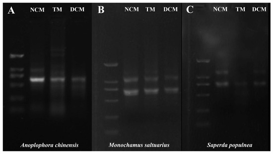 Gel electrophoresis images for haemolymph RNA obtained by three collection methods in adults of three cerambycid beetle species. (A): Gel electrophoresis images for haemolymph RNA obtained by three collection methods of Anoplophora chinensis. (B): Gel electrophoresis images for haemolymph RNA obtained by three collection methods of Monochamus saltuarius. (C): Gel electrophoresis images for haemolymph RNA obtained by three collection methods of Saperda populnea.