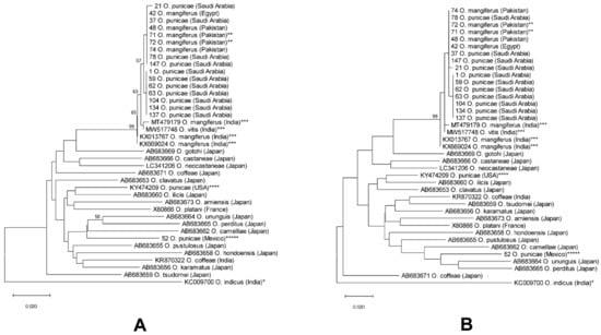 - Matsuda, T.; Hinomoto, N.; Singh, R.N.; Gotoh, T. Molecular-based identification and phylogeny of Oligonychus species (Acari: Tetranychidae). J. Econ. Entomol. 2012, 105, 1043–1050. [Google Scholar] [CrossRef]