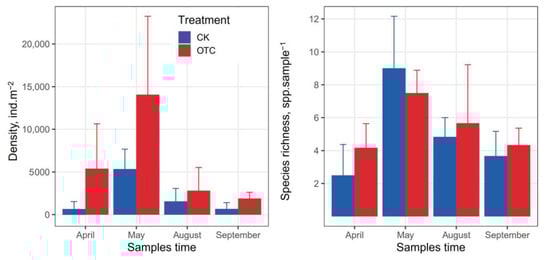 In the four periods of 2018, Collembola from the six warming and six control replicate plots were collected, using an aspirator (modified air blower, Stroke 4-GX 35, Honda, sampling diameter of opening = 14 cm) []. The extracted soil animals were preserved in 75% ethanol for identification. The Collembola were identified to species or morpho-species level according to the methods of Christiansen and Bellinger [] and Hopkin []. Air temperature and air humidity (50 cm above the horizon) was continuously measured from 15th April to 15th September using a HOBO thermometer (Onset, Cape Cod, MA, USA) and an ECH2O dielectric aquameter (Em50, Digital Data Logger, Decagon Devices Inc., Pullman, WA, USA), respectively. Soil organic carbon (SOC) and soil total nitrogen (TN) were measured using an elemental analyzer (vario MACRO cube, Elementar, Langenselbold, Germany). For measuring the shoot and root biomass in control and warming treatment, the plants in the OTCs and control (length × width = 10 cm × 10 cm) plots were chose and sampled in July and September 2018. The stems of plants from both warm and control plots were cut at the ground surface and the roots and shoots were washed and dried at 80 °C for 72 h to determine their dry biomass. Soil organic carbon (SOC) and total nitrogen were also measured at the same time.