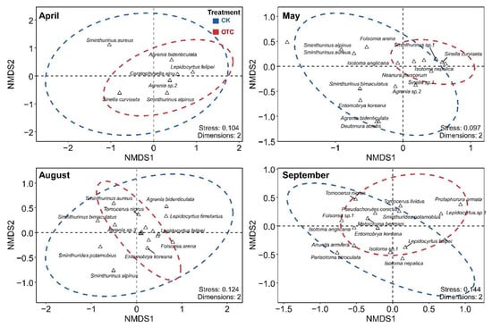 Non-metric multidimensional scaling (NMDS) ordinations of the Collembola communities at different sampling time (April, May, August, and September) and treatment (CK, OTC).
