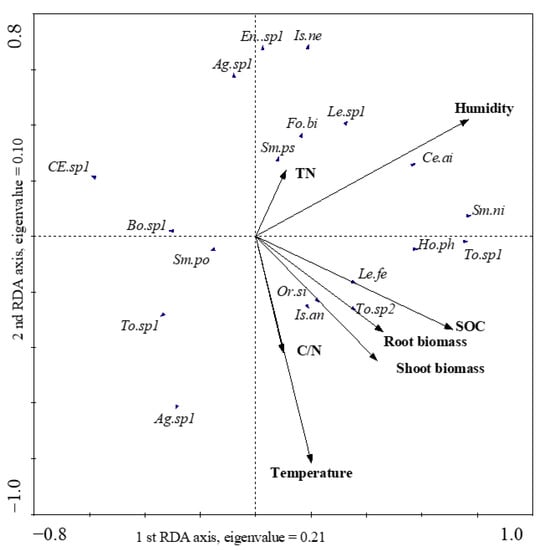 CANOCO Version 4.5 (ter Braak and Šmilauer, 2002) was used for data analysis. A multivariate redundancy analysis (RDA) was used to analyze the effect of environmental parameters including temperature, humidity, root biomass, shoot biomass, soil organic carbon, and total nitrogen on soil Collembola communities. Collembola species with more than 10 individuals were included in subsequent analysis. Monte Carlo permutation tests (999 permutations) were used to test the significant effects.