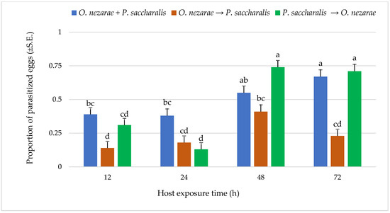 For each treatment (order of oviposition × time interval), 20 replications were performed. The minimum exposure (12 h) and host egg density (24–30 kudzu bug eggs per replicate) were chosen based on the previous studies for P. saccharalis [51] and preliminary studies for O. nezarae (unpublished data) that demonstrated both species alone can parasitize at least one egg/h. Increasing host-limitation over extended periods (e.g., 72 h and 24 eggs) would increase the likelihood of interspecific competition.