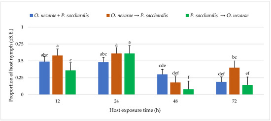 Out of 6147 M. cribraria eggs, a total of 2501 were parasitized. The proportion of parasitized host eggs was affected by the order of the two competitors’ release and the period after they first oviposited (Figure 1). Over the entire experiment, the distribution of parasitoid attack was generally higher with increasing host exposure time, with the exception of O. nezarae to P. saccharalis, indicating that prolonged exposure time provides parasitoids an advantage in parasitizing more host eggs (Figure 1). The increase in parasitism also resulted in a decrease in kudzu bug nymph survival (Figure 2). Interestingly, the host eggs where P. saccharalis first oviposited and were followed by O. nezarae showed higher mortality with longer exposure times (Figure 1).