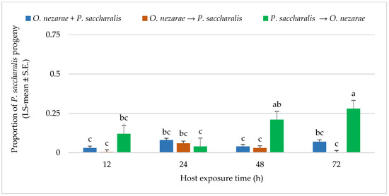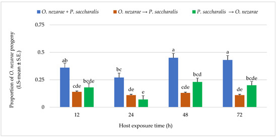 Ooencyrtus nezarae showed differences in its emergence when competing against P. saccharalis. From a total of 1893 parasitoids, O. nezarae yielded an average of 0.74 offspring. The emergence of O. nezarae offspring was higher when their oviposition was simultaneous with P. saccharalis (Figure 3). It is noteworthy that O. nezarae emergence was relatively higher when the host eggs were exposed to both parasitoids for a prolonged period of 48–72 h (Figure 3). In addition, the proportion of O. nezarae offspring was around one-fold higher when O. nezarae arrived second to the host and when there was a delay of more than 12 h between oviposition of P. saccharalis and O. nezarae. It indicated that O. nezarae won almost all competitive events in the parasitized hosts.
