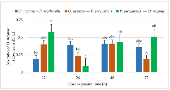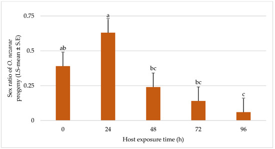 In most of the situations, the sex ratio of O. nezarae was male-biased and there was a trend towards longer duration experiments showing less favorable effects on female emergence of O. nezarae (Figure 7).