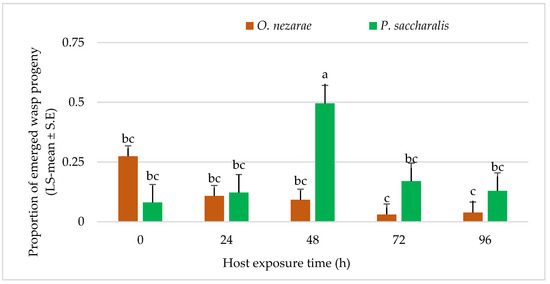 LS-mean (±SE) of Ooencyrtus nezarae and Paratelenomus saccharalis progeny that emerged from host eggs among treatments. Data were graphed with one-way ANOVA using simulated multiple comparison test (F =10.91, df =4, 95, p < 0.0001 for the main effect i.e., host exposure time). Different letters indicate a significant difference at p < 0.05. (Sample size, n = 20).