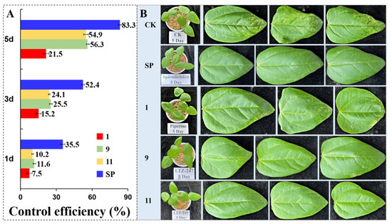 The control efficiency (A) and symptoms (B) of cowpea leaves infected with T. cinnabarinus on the 5th day after treatment with SP (spirodiclofen), 1 (piperine), 9 (LTZ–247), and 11 (LTZ–249) (CK: aq. Tween–80 (1 g/L)).