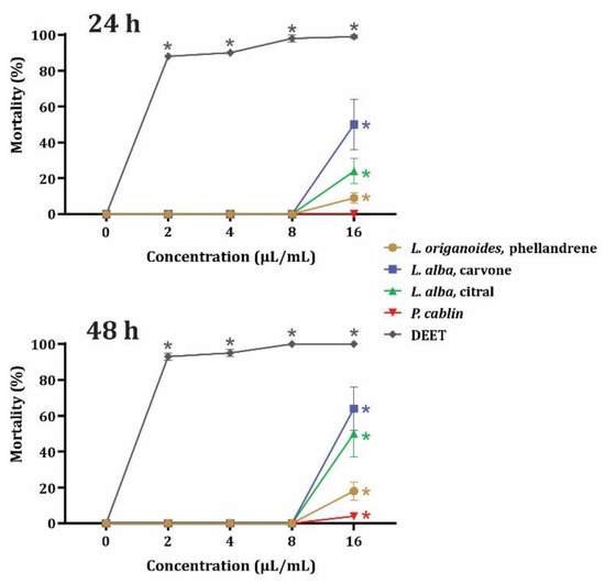 The results of contact toxicity are presented in Figure 1. Compared to DEET, the four evaluated EOs exhibited lower toxicity against U. dermestoides. The toxicity decreased in the order carvone-rich L. alba > citral-rich L. alba> phellandrene-rich L. origanoides > P. cablin. In contrast, the commercial repellent caused more than 80% mortality at the lowest tested concentration (2 μL/mL) at both 24 and 48 h exposure. An interesting point displayed in Figure 1 is that the biological activity of the EOs was more variable than that elicited by DEET.