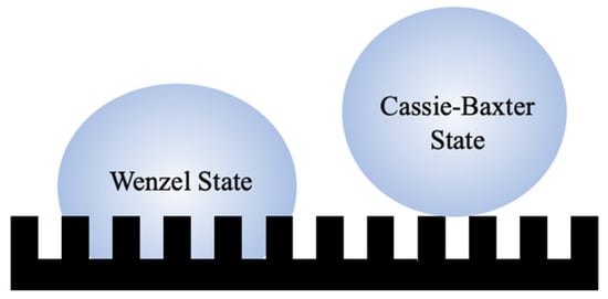 There are two models which characterize the wettability of a rough surface: the Cassie–Baxter model and the Wenzel model [,]. The Cassie–Baxter model includes a nonhomogeneous, three-phase liquid–air–solid interface []. In this model, air pockets are trapped between water droplets and the structured surface (Figure 1) [,]. The Wenzel model is a homogeneous, two-phase regime featuring a liquid–solid interface where water droplets penetrate the surface structure and are pinned at the surface (Figure 1) []. The hydrophobic nature of a material in this case is enhanced mainly due to an increase in surface area from surface roughness.