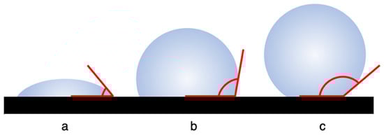 Calculating the contact angle between the water droplet’s perimeter and the material’s surface is one method used to characterize wettability. The contact angle can range from 0° (superhydrophilic) to 180° (superhydrophobic). Contact angles between 0° and 90° are hydrophilic, while contact angles between 90° and 150°, and 150° and above, are characterized as hydrophobic and superhydrophobic, respectively (Figure 2). The advancing contact angle describes the contact angle between the droplet and the surface as water is applied while the receding contact angle describes the contact angle between the droplet and the surface as water is removed or evaporates. A surface that demonstrates droplets in the Wenzel state may be characterized as hydrophobic, but superhydrophobic characterization only occurs on surfaces with droplets in the Cassie–Baxter state [].