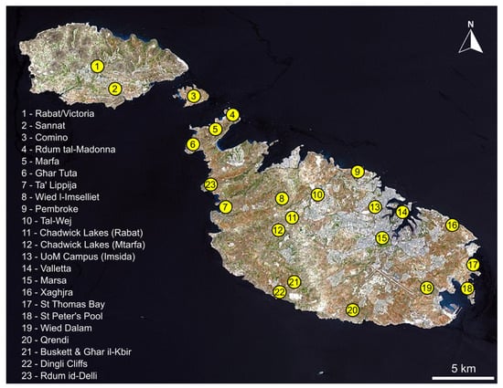 The Maltese Islands are situated in the centre of the Mediterranean Sea, aligned in a North-West to South-East direction. The total area of the archipelago amounts only to 316 km2, and they lie some 96 km to the south of Sicily and some 350 km north of the Libyan coast. Malta, Gozo and Comino—the three largest islands of the archipelago—are inhabited, with a collective population of almost 520,000 people and the fifth-highest population density of any country in the world at 1649 persons per square kilometre. A number of uninhabited islets and rocks also occur along the coast. The climate is typically Mediterranean, with hot, dry summers and mild, wet winters. Despite enormous human pressures on the natural environment of the Islands, they are home to an estimated 4500 species of terrestrial and freshwater arthropods, and hundreds of species continue to be added to the archipelago’s known fauna—including various newly described taxa [,,,,]. Such burgeoning island biodiversity paired with rapid urban encroachment into natural habitats has great implications for conservation.