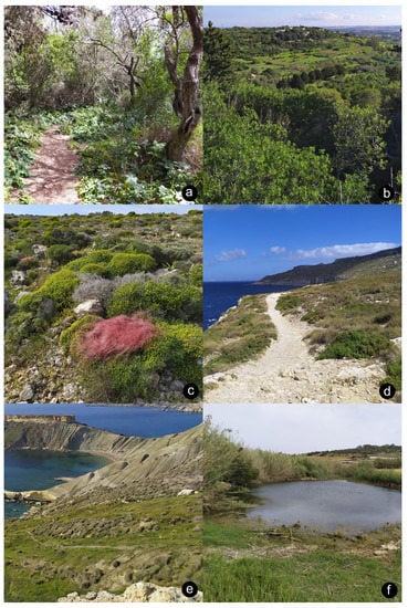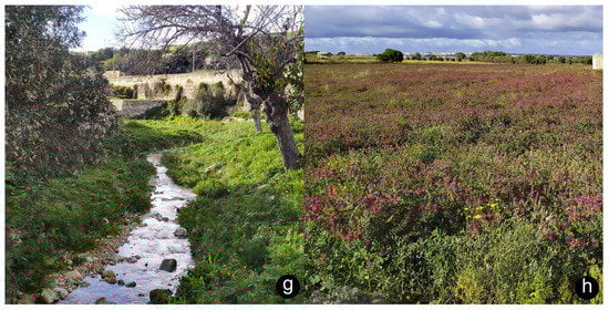 Sampled habitats in the Maltese Islands. (a) Semi-natural woodland, Buskett; (b) mosaic of maquis and agricultural land, Buskett; (c) garigue/phrygana, Marfa, Mellieħa; (d) coastal cliff plateau with sandy soil and low-growing vegetation, Miġra Ferħa, Rabat; (e) coastal clay slopes with steppe, Qarraba and Ġnejna Bay, Mġarr; (f) valley freshwater pool with loamy banks vegetated by Arundo and Paspalum, Imselliet Valley; (g) valley freshwater stream with gravel and diverse herbaceous vegetation, Lunzjata Valley, Gozo; (h) agricultural field growing animal fodder, Żebbuġ.