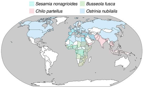Distribution map of Chilo partellus, Busseola fusca, Sesamia nonagrioides and Ostrinia nubilalis. The map shows the countries where the presence of each species has been recorded in the literature, based on records gathered by the Centre for Agricultural Bioscience International shared under license CC BY-NC-SA 3.0 [45]. There are overlaps between the four distribution ranges, shown by the superposition of colors, particularly in Africa, where S. nonagrioides, B. fusca and C. partellus are found.