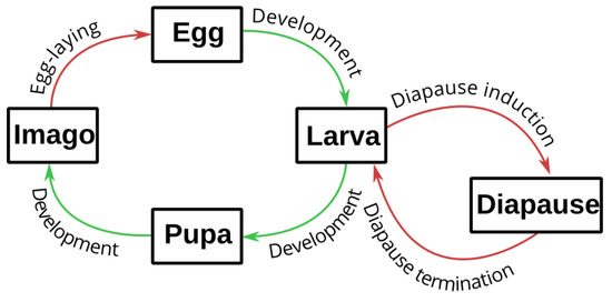 - Damos, P.; Savopoulou-Soultani, M. Temperature-driven models for insect development and vital thermal requirements. Psyche 2012, 2012, 123405. [Google Scholar] [CrossRef]