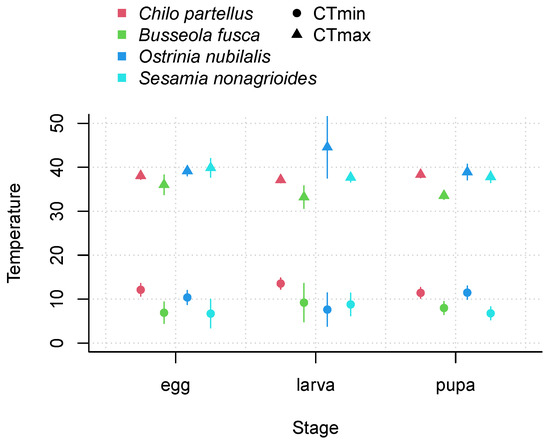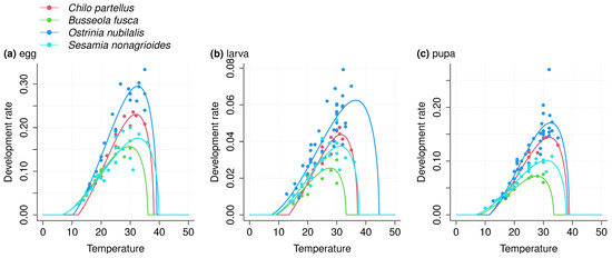 To predict the immature development time of four maize stemborers, we adjusted mathematical models to relate development rate and temperature for each life stage of each species, using nonlinear regressions on aggregated average development rate data measured at constant temperatures extracted from the literature. We estimated higher values for the egg and larval stages of O. nubilalis and S. nonagrioides, resulting in larger thermal ranges. This is in line with previous studies that have established a relationship between latitude and thermal range, explained by the fact that species at higher latitudes are confronted with wider thermal variations [33]. In this study, the two species with greater thermal range are found at higher latitudes, i.e., S. nonagrioides and O. nubilalis [42,43], while C. partellus and B. fusca are found exclusively in the tropical regions of sub-Saharan Africa [44]. However, the standard errors of parameter estimates characterizing the TPC of each life stage showed that uncertainty remains, particularly for the larval stage of O. nubilalis, for which the standard error of the estimate was the greatest, due to the lack of experimental data in higher temperatures. In addition, this parameter is likely to be overestimated, as a modeling study on the development rate of O. nubilalis found a lower value for ( °C, [94]) using a model from [95].