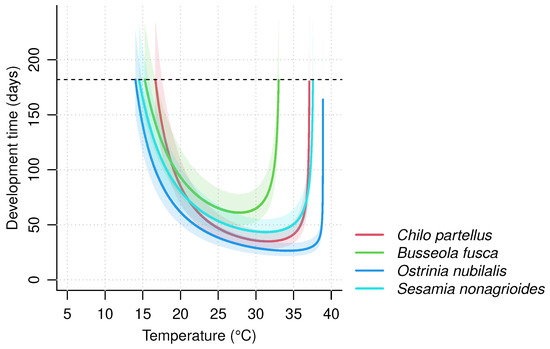 Impact of temperature on the total development time of Chilo partellus, Busseola fusca, Ostrinia nubilalis, and Sesamia nonagrioides. The development time was predicted for 5000 individuals by summing the inverse of development rates of each life stage. The development rates were drawn in a normal distribution with and , where is the development rate predicted by the TPC of each life stage j. Mean development times as a function of temperature for the four species are represented. The 95% prediction interval is shown in transparency. The dashed line represents the 182-day limit for median development times that we fixed for characterizing the minimal and maximal temperature thresholds of each species.