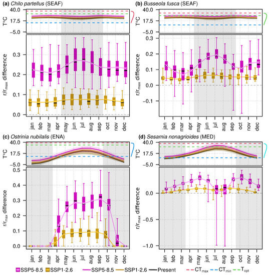 Maize is a cereal cultivated for human consumption and as a fodder crop, so that its production is among the largest in most regions of the world. Maize production is mainly constrained by weed competition worldwide [38], but crop losses due to animal pests, most of which are insects and mites, could reach 16% of world production in the absence of crop protection [38]. In particular, insects are important pests in areas where farmers have limited resources and small cultivated surfaces (<2 ha) bordered by natural patches with wild host plants [39]. In sub-Saharan Africa, lepidopteran stemborers are the main limitation to increasing grain production [39] and can represent losses from 5% to 73% of potential yields [39,40]. Similarly, in Europe, lepidopteran stemborers can represent losses from 5% to 30% in the absence of control measures [41]. To better understand the potential impact of climate warming on pest insects, our objective is to assess the effect of temperature increase on the development time of maize pests through a modeling study focused on four Lepidoptera in tropical and temperate climates: the European corn borer Ostrinia nubilalis Hübner (Lepidoptera: Crambidae), the Mediterranean corn borer Sesamia nonagrioides Lefebvre (Lepidoptera: Noctuidae), the spotted stem borer Chilo partellus Swinhoe (Lepidoptera: Crambidae), and the maize stalk borer Busseola fusca Fuller (Lepidoptera: Noctuidae). These species were chosen because they are major pests of maize in tropical and temperate climates [42,43,44], and because they share similar life cycles and biology, facilitating the construction of consistent developmental models, while having their own ranges across latitudes (Figure 1). For each species, we used temperature predictions for current conditions and future conditions under two greenhouse gas emission scenarios to predict the fraction of the maximal development rate of each species reached in each month of the year, and we computed the differences between future and current conditions to quantify the positive or negative impact of global warming on species development. In all geographical areas, species will be confronted with higher temperatures as a consequence of global warming, but the impact on development varies between species, scenarios, geographical regions and months due to the non-linearity of the TPCs.