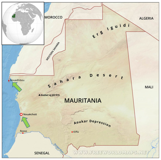 Representation of Mauritania, West Africa. The two localities in which the bed bugs were collected in domestic settings, between September 2021 and October 2021, are indicated with green arrows (from North to South: Nouadhibou and Nouakchott).