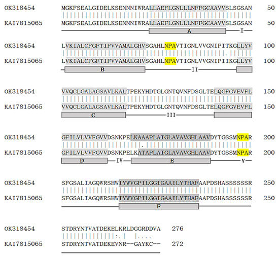 The alignment of amino acid sequences of R. dominica prip from one cloned from this study (Accession no. OK318454) and the other from the genome (Accession no. KAI7815065). The six transmembrane regions (A–F) are indicated by a gray background. The two NPA (Asn–Pro–Ala) motifs located on the second and fifth loops are marked in yellow.