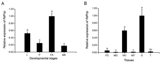 Developmental (A) and tissue (B) profiles of RdPrip expression. The error bar represents the standard error of three replicates. Different letters indicate significant differences between treatments (p < 0.05). L: larvae; P: pupae; FA: female adults; MA: male adults; FG: foregut; MG: midgut; HG: hindgut, including cryptonephridial systems; MT: Malpighian tubules; O: ovary; T: testis.