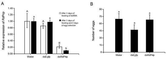 The dsRdPrip RNA was synthesized using the MEGAscript RNAi Kit (Thermo), following the manufacturer’s instructions. The plasmid containing the cDNA of RdPrip or Egfp (control) served as templates for PCR amplification. The PCR primers, RdPripdsRNA-03, and RdPripdsRNA-04, with a T7 promoter sequence at the 5′ end and a gene-specific part for RdPrip are listed in Table 1. For the feeding treatment, 10 mated female adults of similar age were placed into one well of a 24-well plate containing 0.2 g of dried wheat flakes soaked with 35 μg of dsRNA in 300 μL of nuclease-free water. The plate was maintained at 28 °C for 3 days. Subsequently, the females were removed into another 24-well plate with egg collection paper for laying eggs. After 2 days of egg collection, the egg collection papers were removed into a Petri dish (9 cm in diameter) for hatching. There were six replicates in each treatment. RdPrip expression was determined using qPCR. All of the data were analyzed by ANOVA, followed by Tukey’s multiple comparison test.