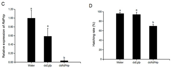 Functional studies of RdPrip were performed using RNAi. After 3 days of feeding on dsRdPrip RNA, dsEgfp RNA, and water, the RdPrip transcriptional expression was decreased significantly, and the knockdown effect lasted for 2 days (Figure 3A). All of the females in the three treatment groups laid eggs, and the fecundity was not significantly different (Figure 3B). However, RdPrip expression was significantly lower in the eggs laid by the dsRdPrip-treated females than in those laid by females subjected to the two control treatments (Figure 3C). Furthermore, the hatching rate significantly decreased after RdPrip knockdown in female adults (Figure 3D).