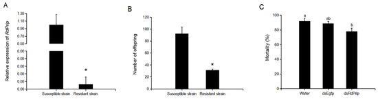 Association of RdPrip functions with spinosad in R. dominica. (A) qPCR analysis of RdPrip in susceptible and resistant strains. (B) The number of offspring was higher in susceptible strains than in resistant strains. (C) The mortality of R. dominica to spinosad exposure after knockdown of RdPrip. The error bar represents the standard error of replicates. * or different letters indicate significant differences between treatments (p < 0.05).