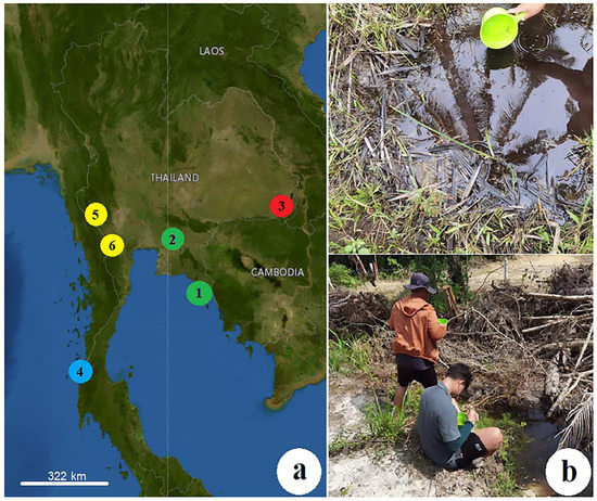 Locations of the sample collection sites (a) and Lutzia larval collection method used in this study (b). Lutzia mosquito samples were gathered from six provinces in four geographical regions of Thailand, including Trat (1), Chachoengsao (2) in the eastern region (green), Ubon Ratchathani (3) in the northeastern (red), Ranong (4) in the southern region (blue), Kanchanaburi (5), and Ratchaburi (6) in the western region (yellow). This map was made available by the USGS National Map Viewer (public domain): http://viewer.nationalmap.gov/viewer/, accessed on 1 October 2022.