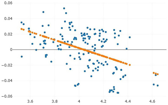 Allometric relationship between the wing centroid size (CS) and wing shape of Lutzia mosquito specimens. The linear regression prediction is shown by the orange dotted line; the y-axis shows the wing shape, and the x-axis shows the wing CS.