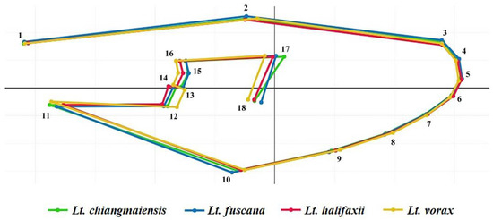 Superimposed wireframe graph showing the superposition of the average wing shape of each Lutzia species, including Lt. chiangmaiensis, Lt. fuscana, Lt. halifaxii, and Lt. vorax.