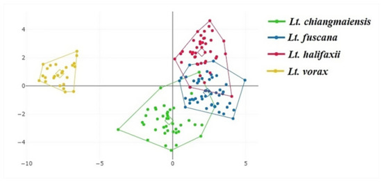 Discriminant space produced by the discriminant analysis of the wing shape of Lt. chiangmaiensis, Lt. fuscana, Lt. halifaxii, and Lt. vorax. Four Lutzia species’ wing shape variations are represented by each polygon, and each dot inside the polygons represents each individual sample.