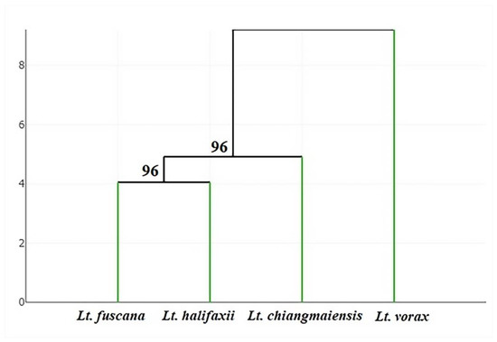Using the GenBank database and the BOLD system for preliminary species identification, the COI sequences of Lt. chiangmaiensis and Lt. vorax obtained in our study were correctly identified (>99% similarity), while a more than 99% similarity overlap between Lt. fuscana and Lt. halifaxii was found from our sequence comparison with available species sequences in the GenBank database and the BOLD system.