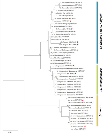 Neighbor-joining (NJ) phylogenetic tree based on Kimura 2-parameter (K2P) distances derived from the 40 COI barcoding sequences of four Lutzia species. Eight sequences from the GenBank database (accession numbers OL743067 and OL743071 for Lt. chiangmaiensis; OL743060 and OL743063 for Lt. fuscana; MK271008 and MK271009 for Lt. halifaxii; OL743058 and OL743059 for Lt. vorax) were used as reference species sequences (red stars). Culex gelidus (accession number: OL743067) was used as an outgroup. The bootstrap values (1000 replicates) below 50% are not shown.