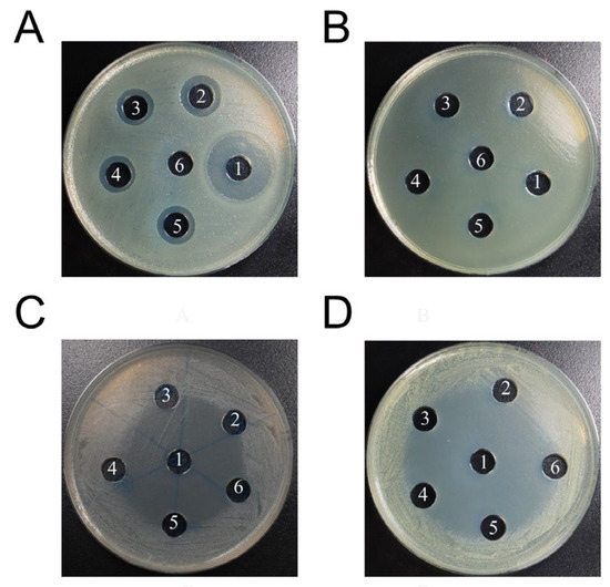 Antimicrobial activities against E. coli (A), P. aeruginosa (B), S. aureus (C), and M. luteus (D). 1: Ampicilin; 2: Peyn-cec; 3: Pvul-cec; 4: Tepn-cec; 5: Hcec-cecB; 6: PBS (negative control). A total of 20 µg of peptide solution or ampicillin was added into each hole.
