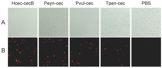 Membrane permeabilization of E. coli by Peyn-cec, Pvul-cec, and Hcec-cecB. E. coli (1 × 106 CFU/mL) were incubated with 4 µg/mL of antimicrobial peptides for 1 h at 37 °C. The bacteria were stained with propidium iodide (PI) and visualized under an optical microscope (A) and a fluorescence microscope (B).